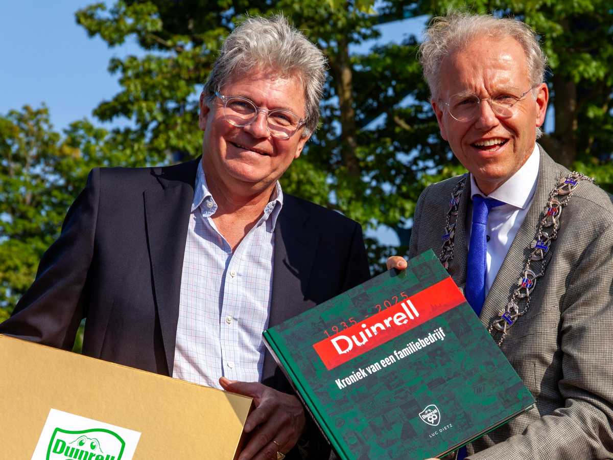 Duinrell-directeur Philip van Zuylen van Nijevelt overhandigde in aanwezigheid van alle medewerkers het eerste exemplaar aan burgemeester Leendert de Lange van Wassenaar (rechts op de foto). De rijk geïllustreerde en luxe uitgevoerde kroniek biedt een kijkje achter de schermen van het attractie- en vakantiepark. Naast de familie zelf delen ook medewerkers, gasten, leveranciers en bekende Nederlanders hun meest bijzondere herinneringen aan Duinrell. “Met de update van het boek blijft veel van onze geschiedenis én onze herinneringen bewaard”, aldus Philip van Zuylen van Nijevelt.