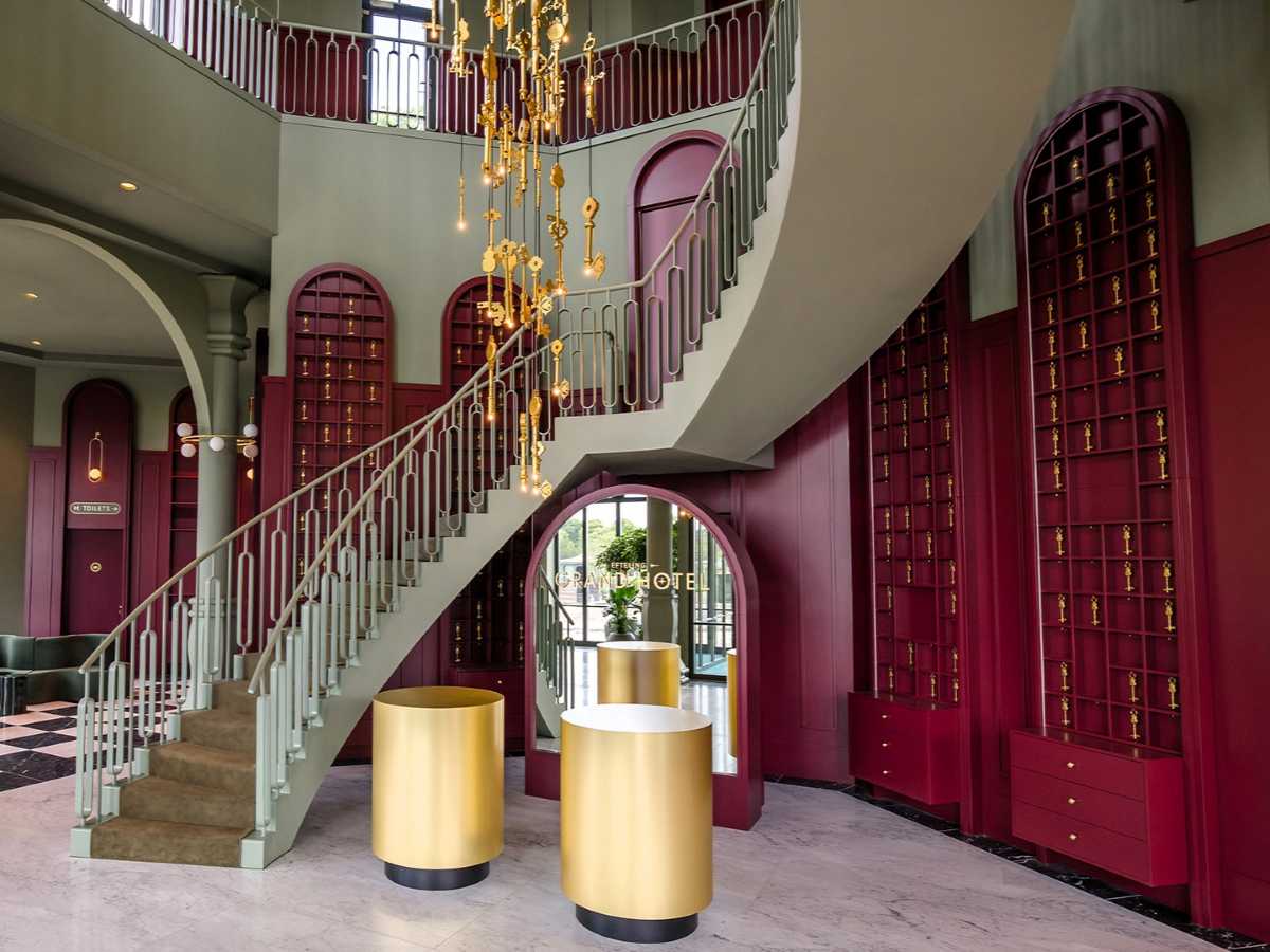 Geen asymmetrische muurtjes met afgebrokkeld stucwerk. Geen raampjes en luikjes in Pieckeriaans blauw. Geen nostalgisch smeedijzer en ook geen ambachtelijke balkenplafonds. Anton Pieck is in het Efteling Grand Hotel ver te zoeken. Twee ingelijste tekeningen van de grondlegger van het Sprookjesbos op iedere kamer, daar blijft het bij. Hotelgasten slapen niet in een suite geïnspireerd op Assepoester, Sneeuwwitje of de authentieke Stoomcarrousel – dat kan wél in het Efteling Wonder Hotel – maar in kamers ‘met gedurfde kleurenpaletten, organische lijnen en hoogwaardige materialen zoals fluweel, marmer en messing’. Zo omschrijft het Amsterdamse interieurdesignbureau Heinzel De Vries hun ontwerp voor het Grand Hotel. “Van de theatrale lobby en de fine dining restaurants tot aan de elegante boetieks, de magie van de Efteling is in elk detail van het hotel te herkennen”, stellen de ontwerpers.