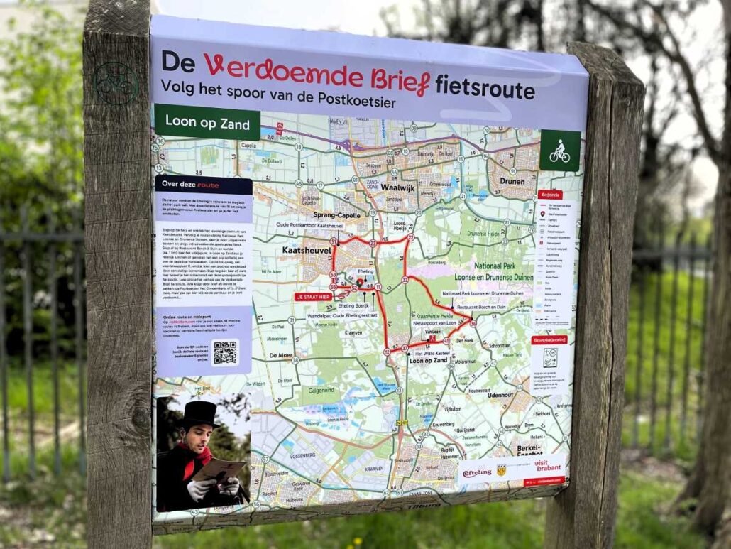 Vanuit het centrum van Kaatsheuvel loopt de fietsroute oostwaarts, richting de Loonse en Drunense Duinen. Het pad van de postkoerier loopt midden door de uitgestrekte bossen en over de indrukwekkende heide- en zandvlaktes waar dit nationale park zo beroemd om is. Het verhaal van De Verdoemde Brief speelt zich af in oktober 1876. Met zijn witte paard Stampvoet en zijn zwarte paard Nachtmerrie bezorgt de koerier plichtsgetrouw alle brieven en pakjes die hem zijn toevertrouwd. Bij herberg Bosch en Duin stopt hij steevast om zijn paarden te laten drinken. Nog steeds is Bosch en Duin, halverwege de route, een pleisterplaats voor bezoekers aan de ‘Brabantse Sahara’. Vanaf dit restaurant loopt een wandelpad van een halve kilometer naar een uitkijkpunt. Vanaf daar is het uitzicht over de stuifzandvlakte adembenemend.