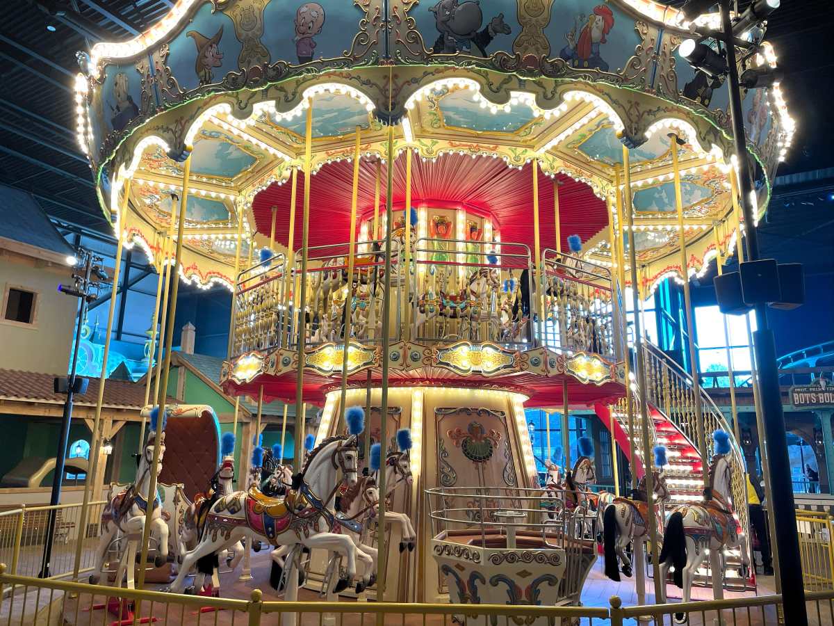 De bijna een hectare grote attractiehal is verdeeld in zes kleine themagebieden. Vanuit het slot wandelen bezoekers de Kasteeltuinen in. Tussen de bloemen rijdt daar de Oude Schicht, het typisch Bommeleriaanse autootje dat door heer Bommel wordt onderhouden met ongebruikelijke middelen als elastiekjes, paperclips en levertraan. In één van de verhalen dreigt het bootje van heer Bommel en Tom Poes te zinken. Ze worden gered door visjes die hun vaartuig door het water trekken. Die Vriendelijke Visjes hebben in het park hun eigen carrousel. De meest indrukwekkende draaimolen staat in de themazone Stad Rommeldam: de dubbeldeks carrousel De Rommeldamse Spil is versierd met de portretten van de belangrijkste bewoners van het stadje.