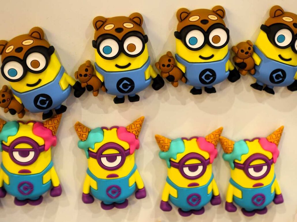 1-Up Factory (Nintendo-winkel met Mario-, Luigi- en Pokémon-souvenirs) – Mario Motors (Mario Kart-themawinkel, in Super Nintendo World) – Ollivanders (toverstokkenwinkel) – Filch’s Emporium of Confiscated Goods (Harry Potter-souvenirs) – Minions Pop Shop (kleurrijke Minion-koopwaar) – Jurassic Outfitters (dino-souvenirs in Jurassic Park) – Beverly Hills Gifts en Universal Studios Store (aandenkens aan Universal Studios)