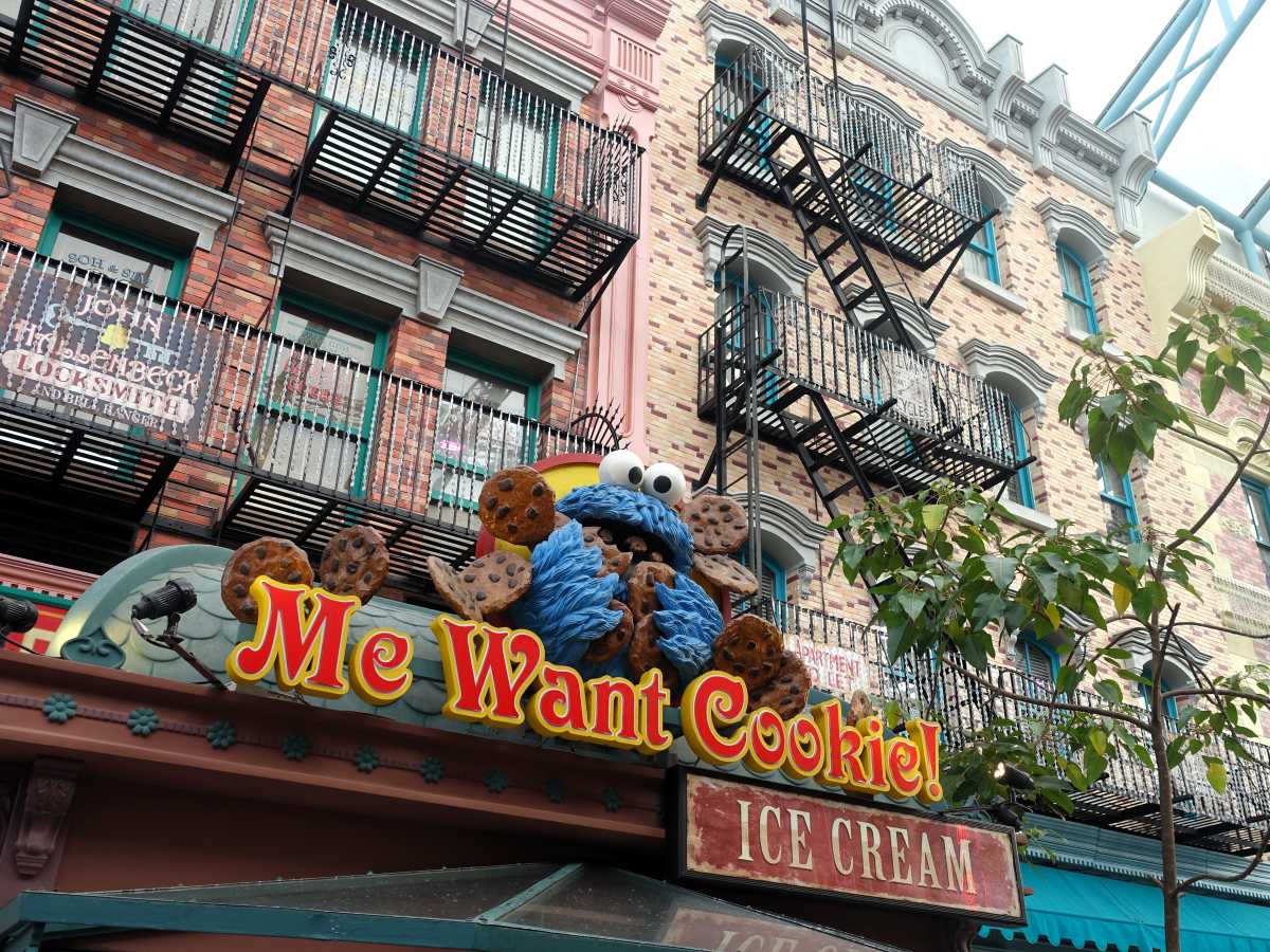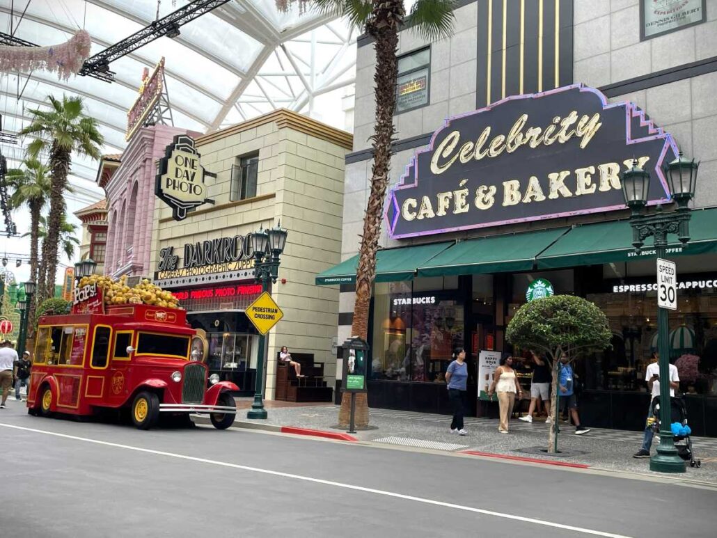 KT’s Grill (Amerikaanse steak- en grillgerechten, in New York) – Oasis Spice Café (Indiase keuken, in Ancient Egypt) – Loui’s NY Pizza Parlor (Italiaanse pizza’s, in New York) – Discovery Food Court (lokale gerechten zoals de pittige noedelssoep laksa, in Jurassic World) – Goldilocks (gefrituurde kip en groene Shrek-wafels, in Far Far Away) – Mel’s Drive-In (drive-in uit de jaren 50 met hamburgers en milkshakes, in Hollywood) – Me Want Cookie! (verkoopwagen met koekjes en ijs, in New York)